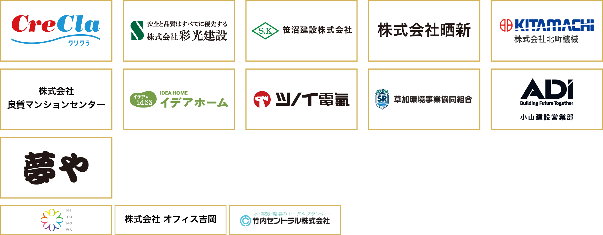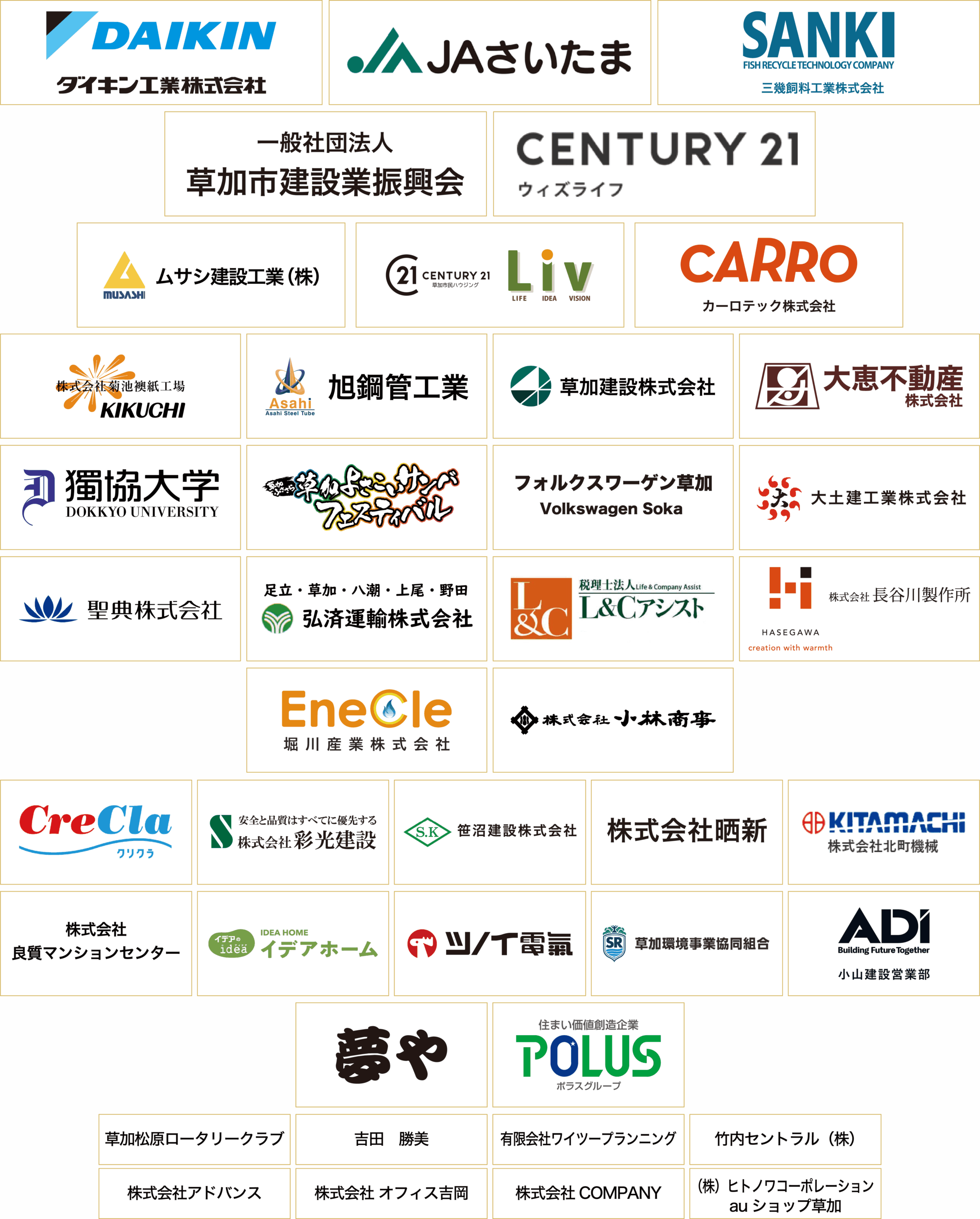 株式会社小林商事/(有)仙成/(株)小川成形社/(株)柴川不動産/(有)川井事務所/ジョインフォース(株)/新日本建設工業(株)/王保保建設工業(株)/あいおい保険イースト/(株)セント/しみずや/(株)Y.C.C/ヒイラギ建設/新井自動車/(有)鈴木自動車工業所/(有)森工務店/草加市バスケットボール協会/(株)グンジ/竹村設計(有)/河陣/草加市陸上競技協会/草加市子ども会育成者連絡協議会/日勝建装株式会社/大地ホーム/(株)親愛/会田塗装(株)/国際ファーストビジネス協同組合/草加市商店連合事業協同組合/荒木表具店/谷塚駅周辺活性化協議会/(有)森工務店/青徳幼稚園/(株)ウシヤマ設計/(株)青葉塗料店/草加市管工事業共同組合/(有)駒崎設備/(株)今泉水道/正木設備(株)/サンコー設備(株)/(株)井戸梅/(株)K-プレイス/佐々木金物店/(株)高千穂保険事務所/(株)篠宮工務店/株式会社埼玉車輌/草加建設株式会社/有限会社埼玉自動車商会/有限会社東邦ハウジング/祐工商事(株)/サシダ商事(株)/有限会社喜作/ワンスタイル/草加ガーデン/株式会社ケー・エム・ビー/有限会社カシュー塗装店/角田良子/(有)恵登屋本店/(有)T・R並木建設/(有)富野屋金物/(株)筑波/(株)今井工務店/(株)村上不動産/光明寺/有限会社エクセル/有限会社マルト/ジャンプジャパン/竹村司法書士/吉田不動産/創仁ホーム/中医整体らくぜん/岡田運輸/ティールームジュン/森紙器/司法書士木村事務所/草加市空手道連盟/高橋電機/やまや酒店/斉藤雅信サイトー工業/秋元秀雄/第一建具/小川不動産/鈴木薬局/共栄旅行/日彰商事/鈴木眞治/草加市剣道連盟/草加市文化協会/草加市バレーボール協会/三ツ矢梱包/風間工務店/公益社団法人草加市スポーツ協会/草加市青少年相撲振興会/山香煎餅本舗/益田建設/386design/マルセン24/オガワホームHP/平成不動産センター/小島商事/ダイヤモンド紙工/サントップ/渋谷商事/ワンヤ真壁時計店/アーム/山本達夫法律事務所/カ)マルヨシ/草加市光陽育成会/草加市陸上競技協会/草加宿神明庵/草加市スポーツ少年団