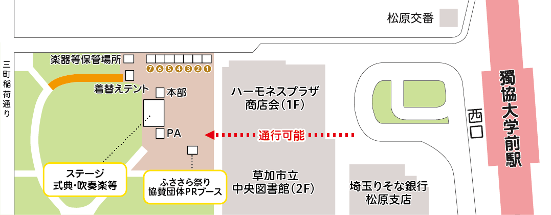 模擬店およびイベント ①模擬店:ドイツ関連模擬店(5店舗7区画) ②ステージ:獨協大学、獨協埼玉高等学校および市内高等学校による吹奏楽・ ダンス披露、提携イベント「草加ふささらダンスフェスティバル」 からダンス披露 |
